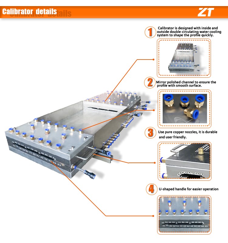 1.Calibrator is designed with inside and outside double circulating water cooling system to shape the profile quickly.