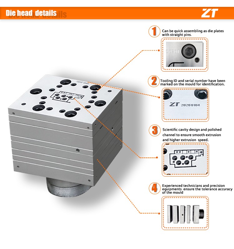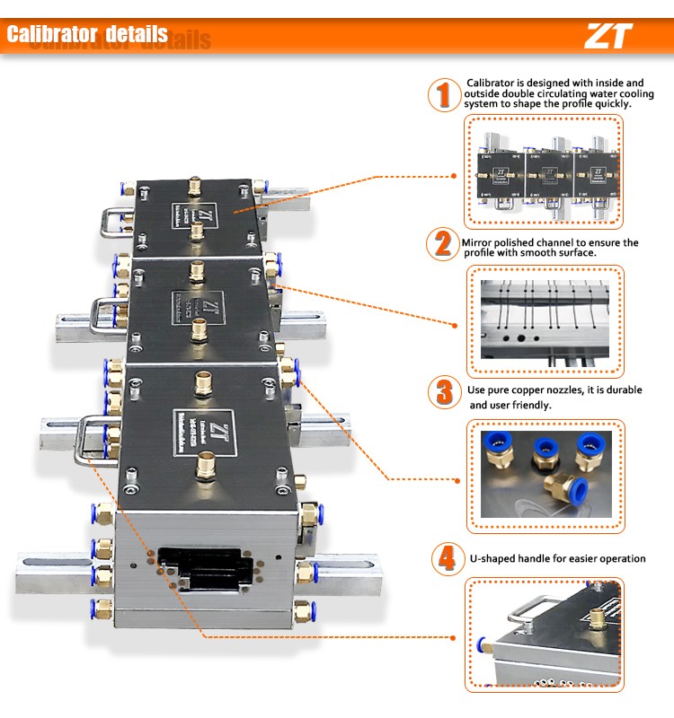 - Mould head is designed with inside and outside double circulating water cooling system to shape the profile quickly.